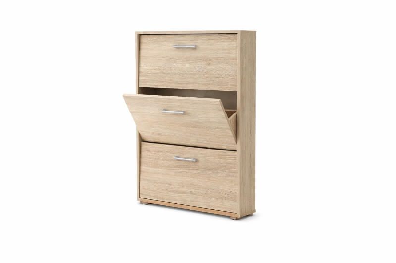 3 lenyitható, cipős tárolóval rendelkezik a képen látható keskeny cipősszekrény billenős 3-as változat. A nyitás billenéssel történik, a cipőket pedig úgy helyezheti el benne, ahogy Önnek kényelmes. Sőt a cipők mellett sálak, kesztyűk számára is ideális választás, hiszen a ruhadarabok könnyen rendszerezhetők benne.
