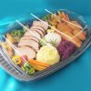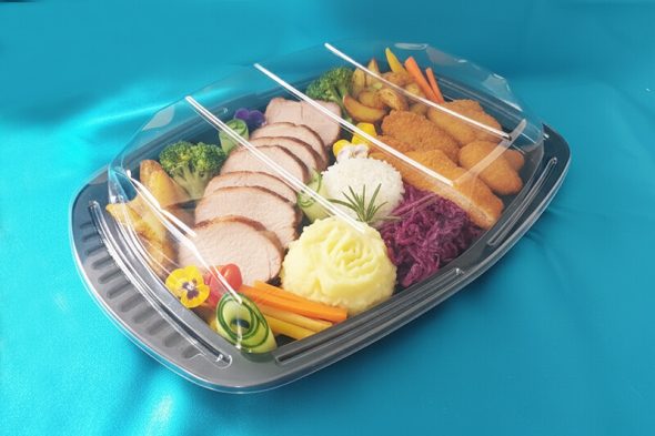 Ez a fekete, eldobható hidegkonyhai tálca választható átlátszó fedéllel kombinálva praktikus, elegáns és biztonságos megoldás hidegtálas, szendvicses vagy sültes ételhez. Ideális professzionális felhasználásra és házhozszállításra, amikor fontos az esztétikum, higiénia és gyors tálalás. A műanyag tálcára kb. 2-3 személyes adag helyezhető el.